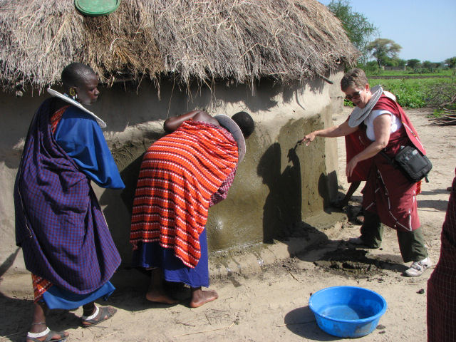 The Maasai women then led us to another hut and sort of pulled Linda over and had her participate in placing a combination of mud and cow dung onto the wall- they washed her hands very carefully after the demonstration was over. I had taken out a Wet Wipe for Linda to use and one of the women noticed it. When I showed it to her and she smelled it she made a face and moved away- strange smells.